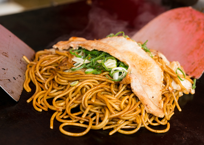 三元豚ネギ焼きそば¥800 モチモチ食感の特製麺に昔ながらのソース味! 三元豚&ネギが舌にガツンとインパクト。
