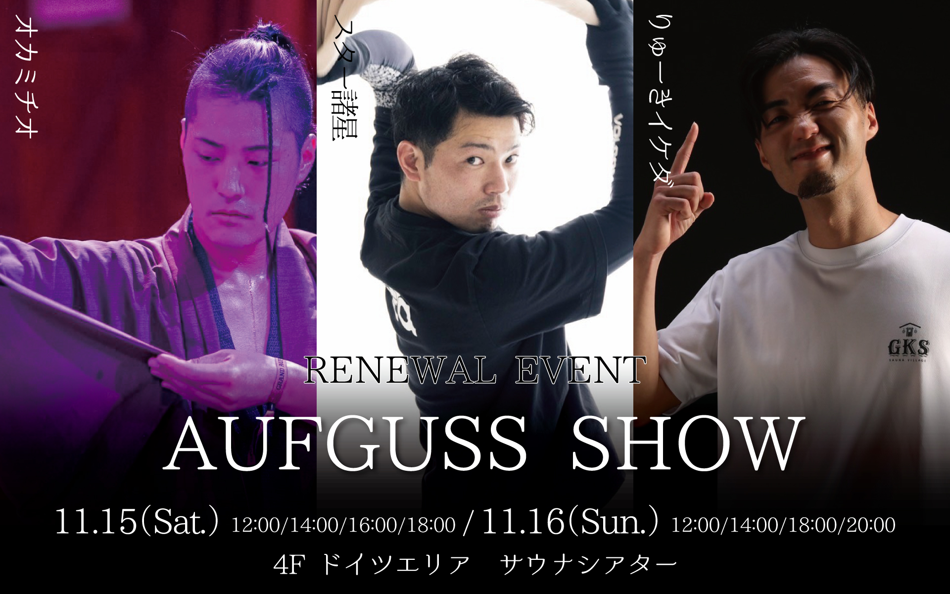 11月15日(土)はスカイスパYOKOHAMA所属「オカミチオ」とガトーキングダム札幌 素面所属「りゅーきイケダ」、16日(日)はK-PRO所属「スター諸星」と「りゅーきイケダ」が男性浴室 大規模サウナで熱風をお届けいたします!