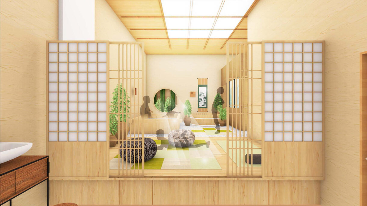 日本エリアに新たにできた茶の湯(さのゆ)エリアは、日本の和をモダンテイストで表現した空間となっております。