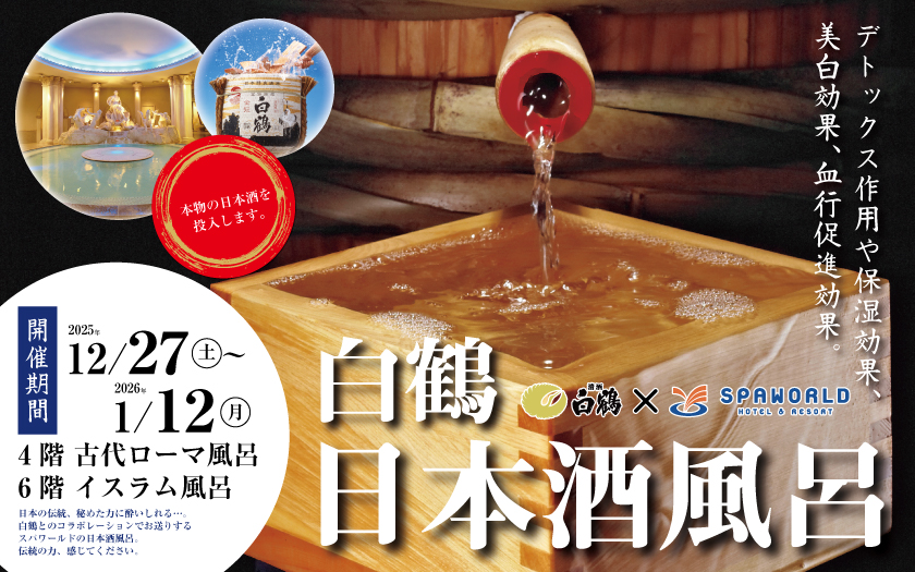 白鶴とのコラボレーションでお送りするスパワールドの恒例日本酒風呂。