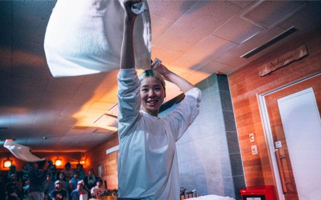 熱波師だけに留まらず、施設のプロデュースや後進の育成まで幅広く手掛ける、北海道サウナ界の中心人物。北海道の雄大な自然を感じさせるパフォーマンスで、サウナ体験を特別なひとときに。