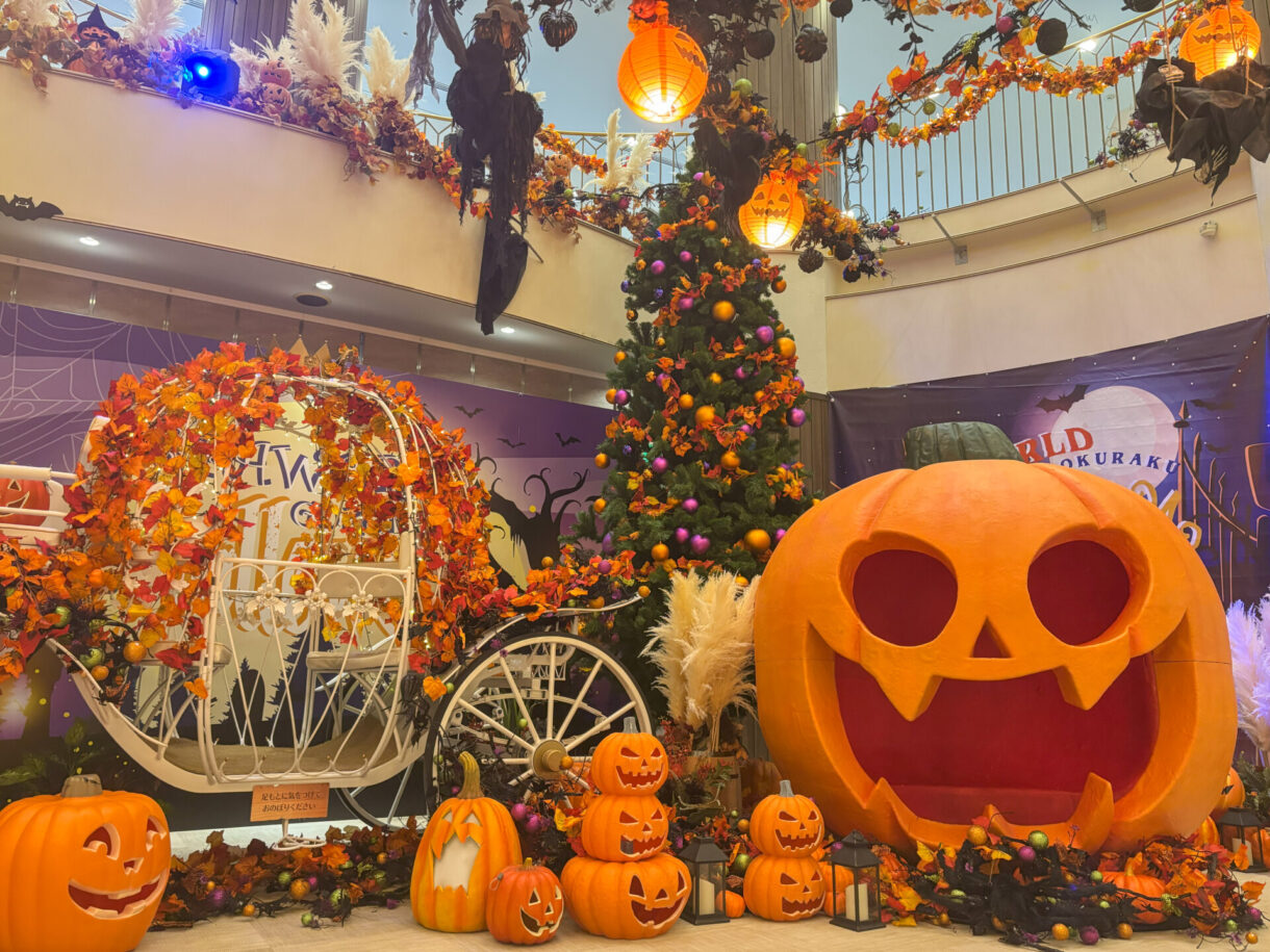 秋一色に彩られた馬車をはじめ、中に入って写真が撮れちゃう巨大カボチャや、空中に漂うカボチャ玉、怖~いガイコツなど、たくさんのフォトスポットが皆さんをお出迎え。
