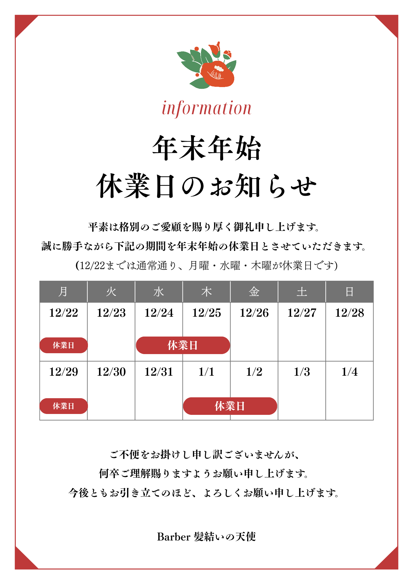 不定休 AM 10:00 ~ PM 7:30 (最終受付 PM 7:00 )